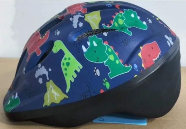 - Modelo OM-TD BIKE: Azul con estampado de dinosaurios, para niño talla pequeña (circunferencia de la cabeza 48–52 cm), marcado “OM-TD BIKE” y “05/2024” en el interior; «Maestro al aire libre» en la parte posterior.