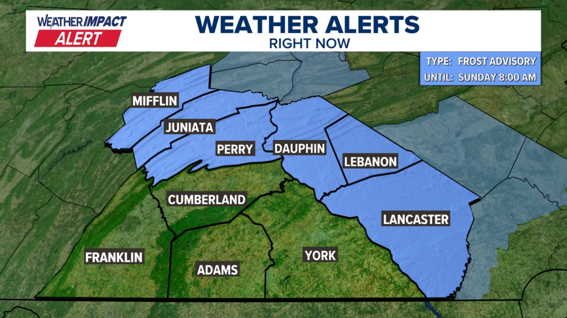Además de nuestra alerta de impacto climático, el Servicio Meteorológico Nacional ha emitido una Aviso de heladas para los condados de Dauphin, Juniata, Lancaster, Lebanon y Mifflin hasta las 8 am del domingo.