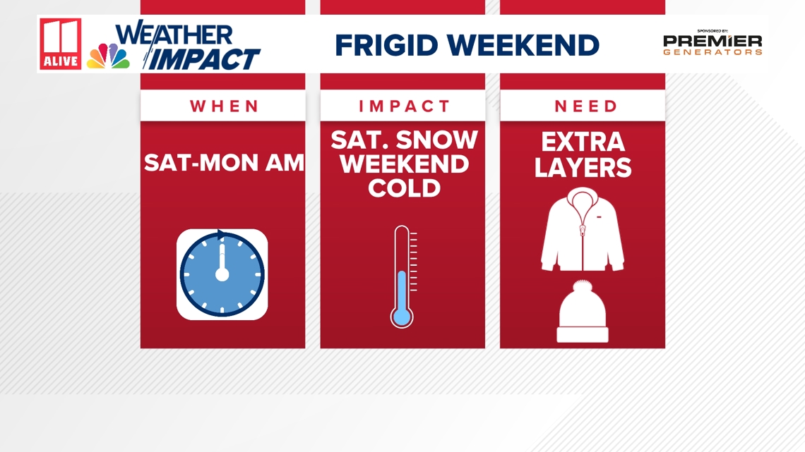 Necesito hacer: Manténgase alejado de las carreteras el sábado donde cae nieve. Para el frío, planifique ponerse capas adicionales y limite el tiempo al aire libre. Esté atento a las tuberías que se congelan a finales del fin de semana. Y esté atento a más puntos resbaladizos y helados de domingo a lunes en medio de la ola de frío.