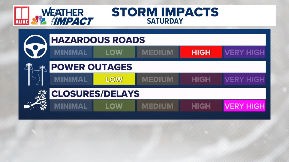 Es probable que los cierres también sean bastante generalizados al este de Atlanta el sábado. Donde cae nieve, se pueden esperar cierres el domingo por la mañana. Y podrían durar hasta el lunes.