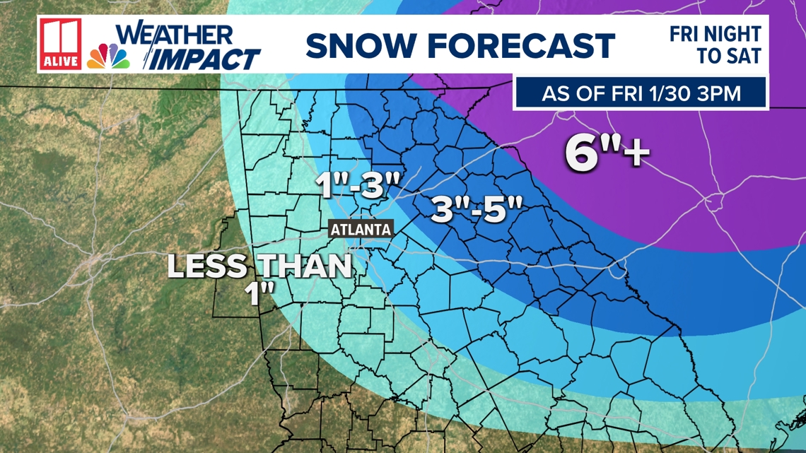 Para Atlanta y el área metropolitana interior, es posible que caigan de 1 a 3 pulgadas de nieve.