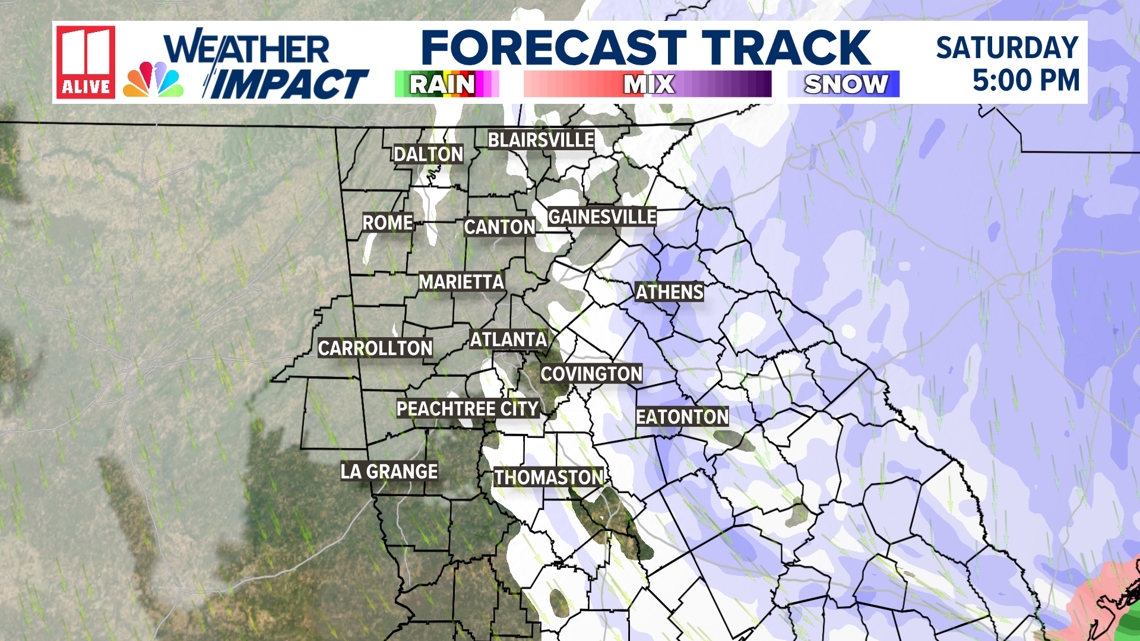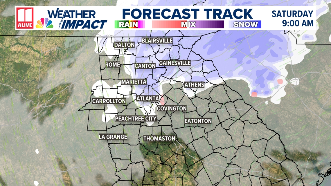 En el oeste de Georgia, las lluvias de nieve podrían provocar una capa rápida, pero la nieve constante y generalizada debería permanecer al este de su área.