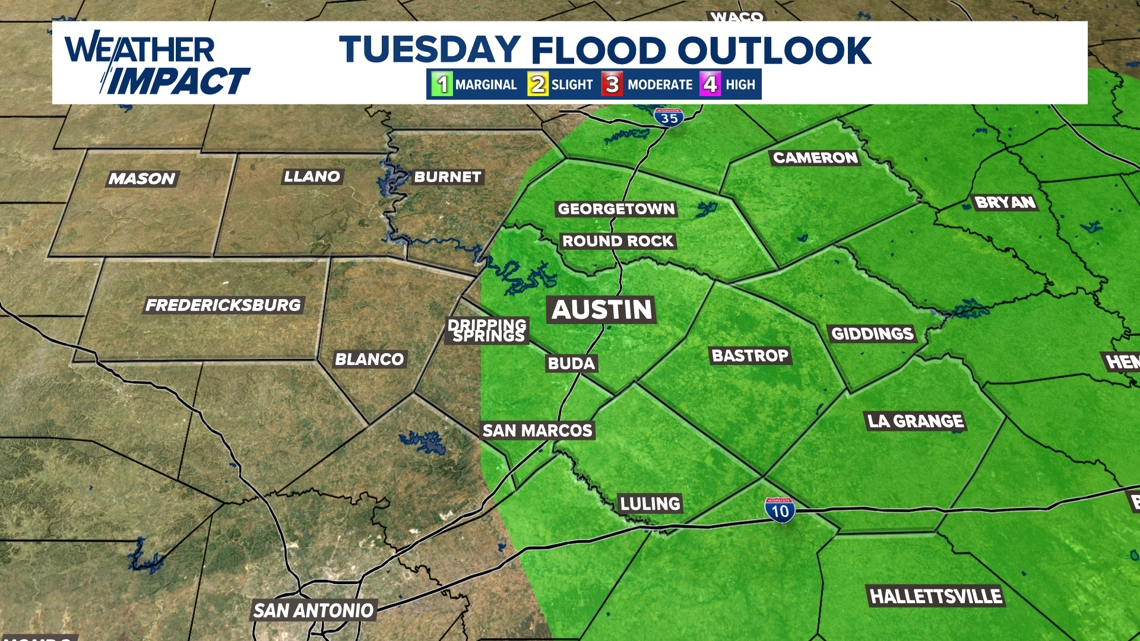 Durante el día del martes, no lloverá constantemente, pero todavía hay un 80% de probabilidad de lluvias y tormentas. A medida que avance el día, la mayor cobertura de lluvia debería favorecer gradualmente las áreas a lo largo y al este de la Interestatal 35. El riesgo de lluvias intensas a nivel local también continuará. Se ha descrito un riesgo de inundación de nivel 1 de 4 para gran parte del área de KVUE, especialmente a lo largo y al este de la I-35.