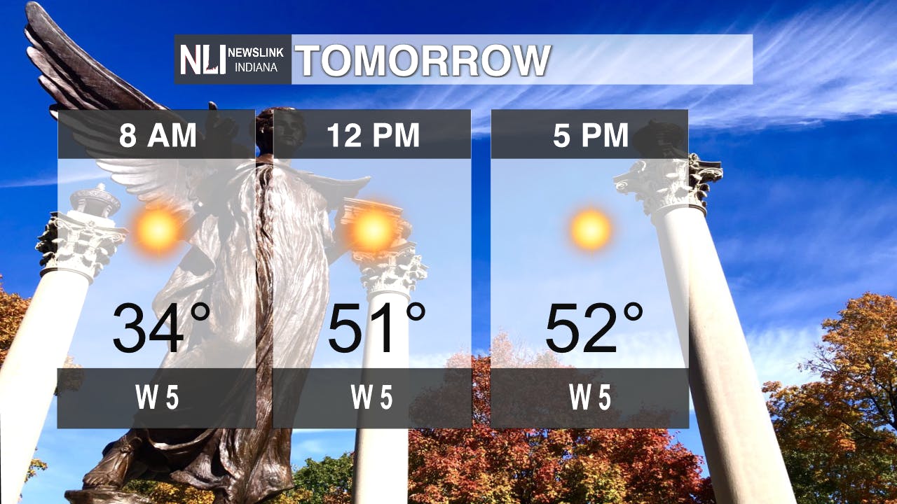 Mañana: Mañana empezaremos a ver ese aumento de temperaturas. Espere que la mañana sea fría con una temperatura de 34 grados, tal vez quiera usar esa chaqueta. Por la tarde, es posible que no necesites tanto esa chaqueta, ya que llega a los 50 grados. El sol brillará todo el día y los vientos permanecerán tranquilos provenientes del oeste a 5 mph.