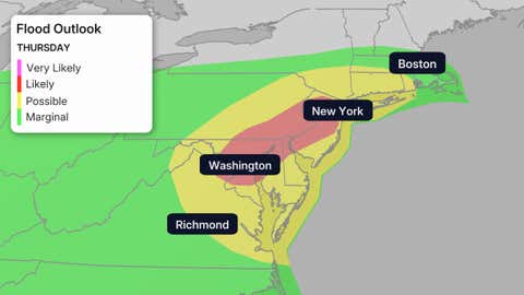 Las inundaciones repentinas son posibles esta tarde y la noche, donde los aguaceros más pesados persisten más tiempo, desde el sur de Nueva Inglaterra hasta el área tri-estatal de Nueva York y el Atlántico medio. Los totales de lluvia localizados podrían alcanzar hasta 4 a 6 pulgadas.