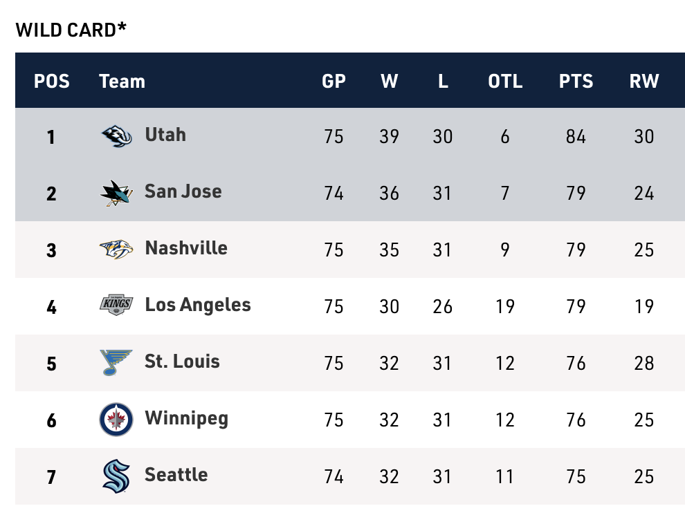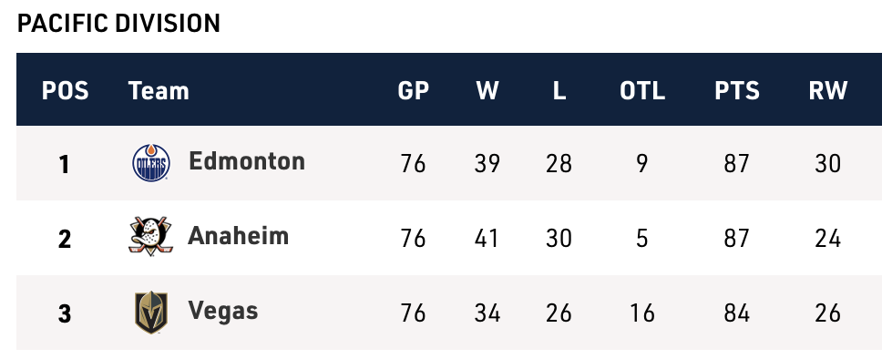 Los Ducks tenían un partido menos que los Oilers, pero lo desperdiciaron en una derrota aplastante ante los Blues el viernes, su cuarta derrota consecutiva. Los Ducks y Oilers ahora están empatados a 87 puntos, pero como también están empatados en juegos jugados, los Oilers se adelantan en el desempate reglamentario de victorias. Mientras tanto, los Blues permanecen al margen de la carrera con la victoria, pero a continuación tendrán partidos consecutivos contra Avalanche, lo que podría sellar su destino si pierden ambos.