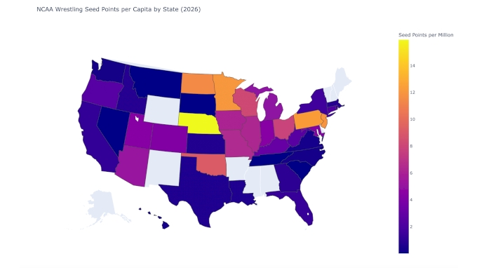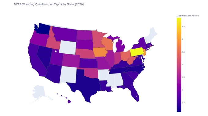 Mi estimado colega JD Rader ya ha proporcionado una lista de la ciudad natal y la escuela secundaria de cada clasificado de la NCAA (que puede encontrar aquí) e incluso proporcionó un excelente mapa de calor para que lo disfruten los fanáticos de la lucha libre.