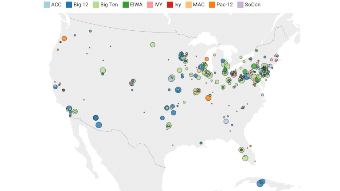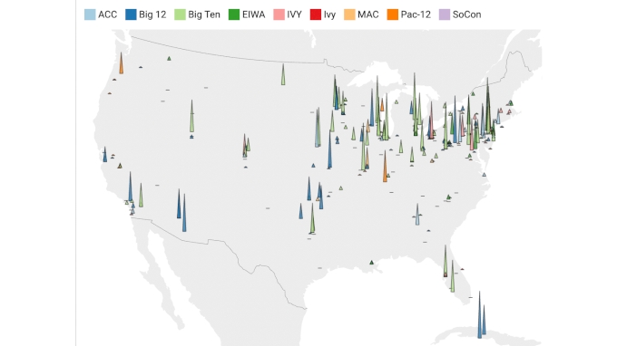 También codifiqué por colores los dos últimos mapas por conferencia. El hecho de que no se pueda decir realmente qué conferencias son más predominantes en diferentes partes del país habla de cómo la mayoría de los programas reclutan a nivel nacional en estos días.