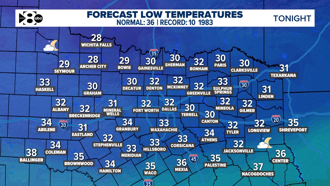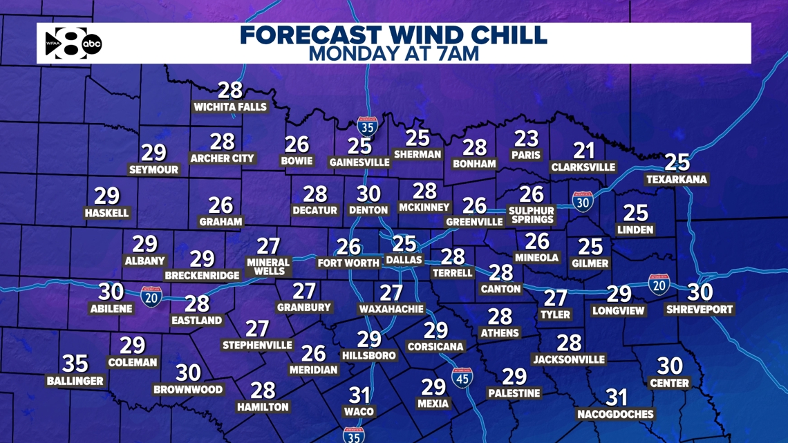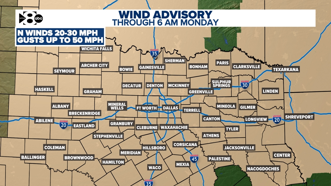 Un frente frío traerá un viento del norte ventoso esta tarde y durante la noche en todo el norte de Texas. ¡A veces pudimos ver ráfagas de viento aisladas de 45 a 50 mph! Esto también contribuirá a mantener la sensación térmica como un factor. Para el lunes por la mañana, las temperaturas agradables bajarán a los 20 grados.