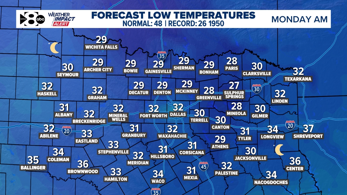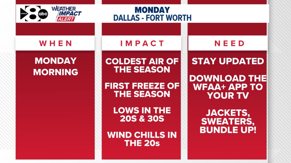Las bajas temperaturas durante la noche y el lunes por la mañana serán muy frías. Se pronostican el aire más frío de la temporada y la primera helada de la temporada. Las mínimas estarán entre los 20 y 30 grados en toda el área. Esto NO es un frío que revienta las tuberías… pero definitivamente querrás cuidar las plantas al aire libre. Haga los preparativos este fin de semana. El sábado sería el mejor día.