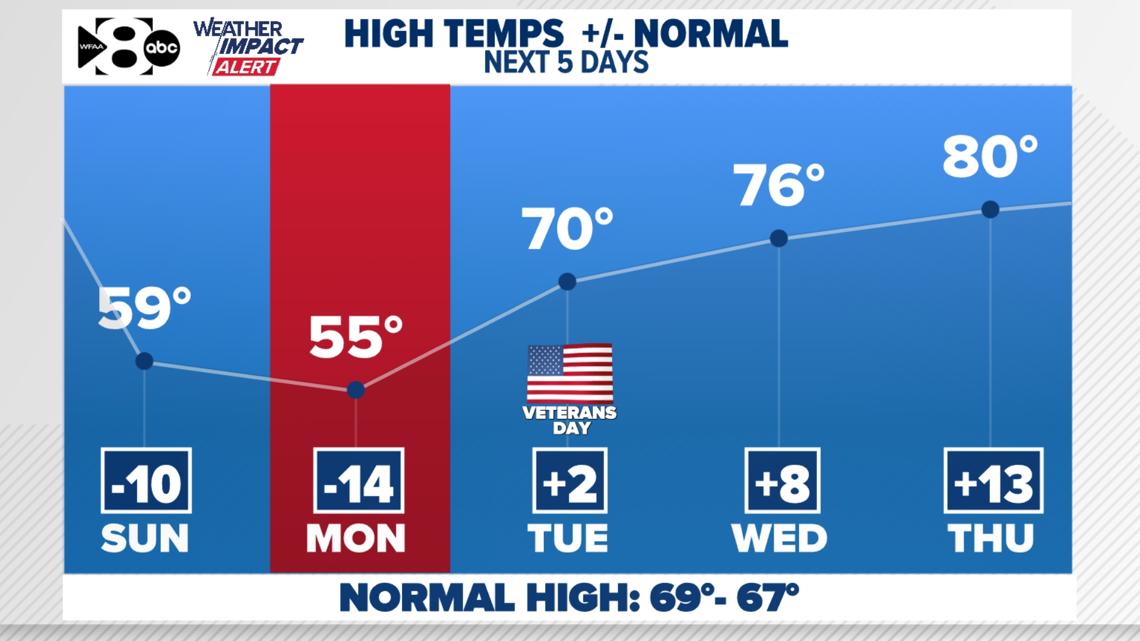 Las máximas incluso volverán a los 80 grados durante varios días la próxima semana y el próximo fin de semana. Se pronostica una pequeña probabilidad de lluvia el próximo domingo.