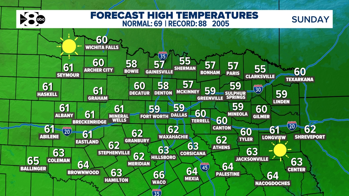 El domingo el tiempo será tremendamente diferente. Los mínimos del domingo por la mañana estarán entre los 40 y los máximos, y los máximos permanecerán en los 50 el domingo por la tarde. El domingo también es un día ventoso con ráfagas de hasta 35 mph. No llueve con este frente… solo un enfriamiento brusco, y eso ni siquiera es lo más frío que llegará. Espera hasta que veas el lunes.