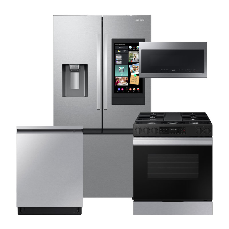Paquete de cocina Samsung de acero inoxidable con 30 cu. Refrigerador de puertas francesas de 3 puertas y mega capacidad con centro familiar y estufa a gas