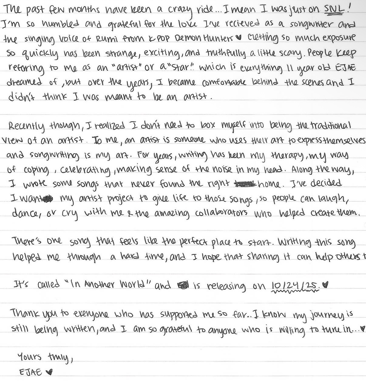 Ejae también reflexionó sobre su viaje artístico: «Solía sentirme más cómodo trabajando detrás del escenario y pensé que no había nacido para ser artista. Pero recientemente, me di cuenta de que no necesito limitarme a lo que esa palabra significa».