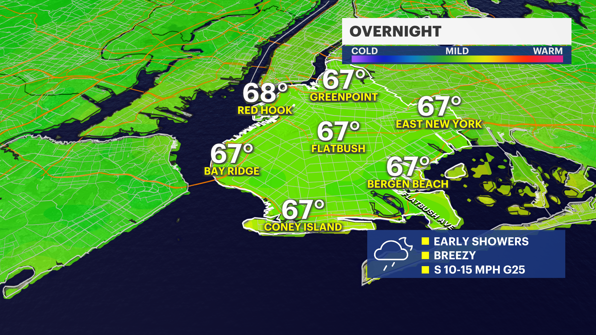 Durante la noche: mínimos en los años 60 más altos. Duchas y tormentas posibles desde el principio, se despeja del amanecer.
