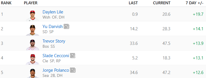 Daylen Lile es el jugador más agregado en las ligas de ESPN en los últimos siete días, ya que ha estado en una lágrima durante el último mes. Especialmente recogió las cosas en las últimas dos semanas, bateando .392 con dos jonrones y una base robada. No puedo decir que hay muchas ventajas a largo plazo aquí, pero este es un juego a corto plazo ahora, así que agrégalo si necesita una producción inmediata en el jardín. Trevor Story ha sido sólida, pero no excepcional en los últimos tiempos, bateando .261 con un jonrón y dos robos la semana pasada. Es un buen complemento si está disponible, pero tiene un 85% de la lista en Yahoo en comparación con el 47% en ESPN. Jorge Polanco también es muy propiedad en Yahoo con un 67% en comparación con el 47% en ESPN, por lo que su inclusión en esta lista es una combinación de su buena obra últimamente y su propiedad alcanzando otros sitios. Darvish y Cecconi completan los cinco primeros, y ambos ya fueron discutidos en el párrafo anterior.