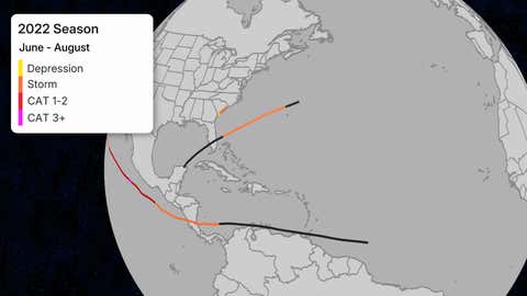 2022 pistas de la temporada de huracanes del Atlántico de junio a agosto (primera imagen), luego de septiembre a noviembre, codificado por la intensidad.