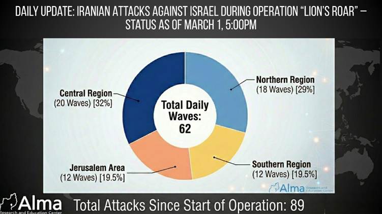 En las últimas 24 horas, hasta las 17:00 horas, se han llevado a cabo 62 oleadas de ataques contra Israel, incluidos lanzamientos de misiles balísticos y vehículos aéreos no tripulados. Desde el inicio de la Operación “León Rugiente” (28 de febrero), se han llevado a cabo un total de 89 oleadas de ataques contra Israel.