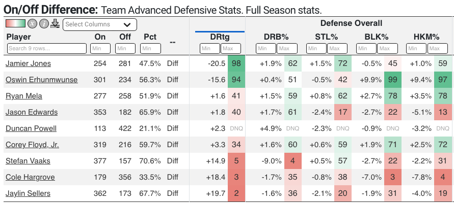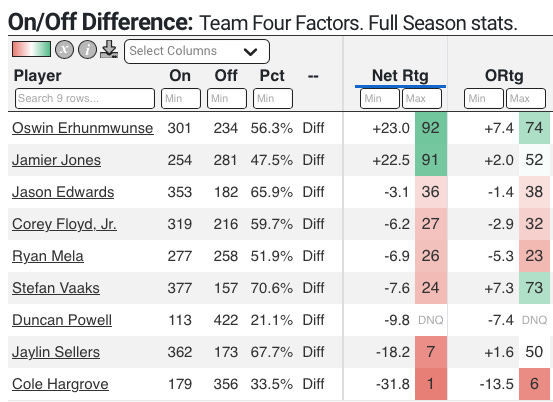 Su índice defensivo (puntos por cada 100 posesiones en contra) cae drásticamente cuando Jones y Erhunmwunse se sientan. El índice defensivo de Providence es casi 21 puntos mejor con Jones en la cancha y 15 con Erhunmwunse. Nadie más en el equipo se acerca particularmente: