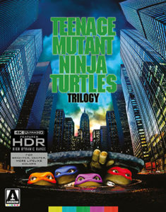 Arrow Video and MVD Entertainment Group Dec. 16 will release the Teenage Mutant Ninja Turtles Trilogy in Blu-ray and 4K Ultra HD disc collector’s editions containing the 1990, 1991 and 1993 live-action films based on the comic book superheroes. The Teenage Mutant Ninja Turtles were created by artists Kevin Eastman and Peter Laird and debuted in 1984 in a comic book published by Mirage Studios. The characters subsequently achieved massive popularity after the 1987 debut of their first animated series, leading to the 1990s films among other notable media tie-ins. The three films use animatronic costumes created by Jim Henson’s Creature Shop to depict the characters — four turtles who have been mutated into human form and become ninja warriors. In 1990’s Teenage Mutant Ninja Turtles, TV reporter April O’Neil (Judith Hoag) is attacked by thugs during a massive crime wave, and rescued by the ninja turtles — Leonardo, Raphael, Michelangelo and Donatello. She discovers they live in the sewer and have been trained in the martial arts by Splinter, a mutated rat with the wisdom of a sensei. April and the Turtles learn the city’s criminals are being guided by the villainous Foot Clan, led by the evil ninja master Shredder. The film was a huge box office hit, topping the weekend charts its first four weeks in theaters, ultimately grossing more than $135 million domestically and, after a series of re-releases, $202 million worldwide. In the 1991 sequel, Teenage Mutant Ninja Turtles II: The Secret of the Ooze, the Ninja Turtles learn more about the mysterious substance that created them as they continue to fight the Foot Clan alongside April (now played by Paige Turco), while Shredder plans to use the last canister of Ooze to create his own vicious mutant warriors. The film includes the infamous scene where the Turtles battle Shredder’s forces at a Vanilla Ice concert as he performs his “Ninja Rap.” The third film, 1993’s Teenage Mutant Ninja Turtles III, finds the heroes transported back in time to feudal Japan after April discovers an ancient magical scepter at a flea market. To survive in the past, the Turtles must save April from the wicked Lord Norinaga (Sab Shimono). The original film has been restored in 4K from the original camera negative by Arrow Films with the approval of director Steve Barron. The sequels feature 4K restorations of the films from the 35mm interpositives. The films are presented with original lossless stereo audio options and optional English subtitles for the deaf and hard of hearing, while the 4K version includes HDR10-compatible Dolby Vision. The limited-edition trilogy boxed set offers collectible packaging that includes a perfect-bound collector’s booklet in the style of a Roy’s Pizza menu; three double-sided foldout posters; eight character trading cards; a Roy’s Pizza loyalty card; and four character stickers.