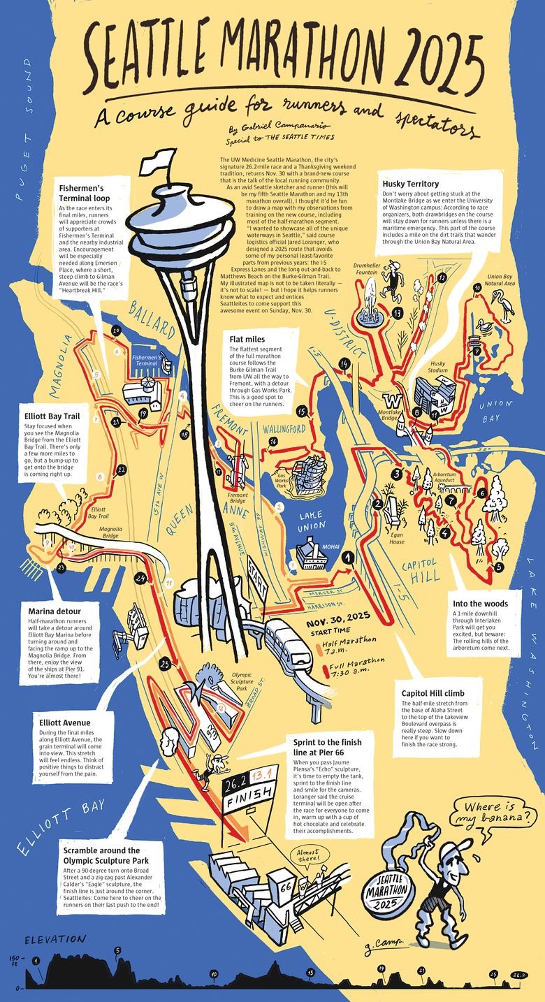Este mapa ilustrado no debe tomarse literalmente: ¡no está a escala! – pero está diseñado para ayudar a los corredores a saber qué esperar y atraer a los habitantes de Seattle para que apoyen este increíble evento el domingo.