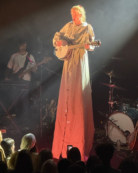 A few nights later, I met Hobert at a bakery in downtown Manhattan, just a few blocks from where she’d lived as a freshman at NYU in 2017; she graduated four years later with a degree in dramatic writing. Hobert, a Los Angeles native, was cradling a hot tea and munching on a piece of banana bread. She was back in town to headline Music Hall of Williamsburg and was trying not to let her persistent flu slow her momentum. Hobert is lanky, with pin-straight strawberry-blonde hair and a deep speaking voice. Every half-hour or so, she pulled out a piece of Nicorette gum and chewed it furiously, a habit she’s had since she quit smoking and vaping two years ago. She wore a knee-length chocolate-brown ’70s shearling coat. Underneath was her usual style, a sort of early-aughts throwback: a three-quarter-sleeve fitted T-shirt, medium-wash boot-cut jeans, and ballet flats. It’s a look that could seem goofy — either out of touch or affected — but Hobert inhabited it with ease. She wears the same thing onstage. “I just throw on whatever’s on my floor,” she told me, “and that sounds maybe corny, but I look like crap most of the time and then it does feel weird to me to, like, go onstage and try to look better.”