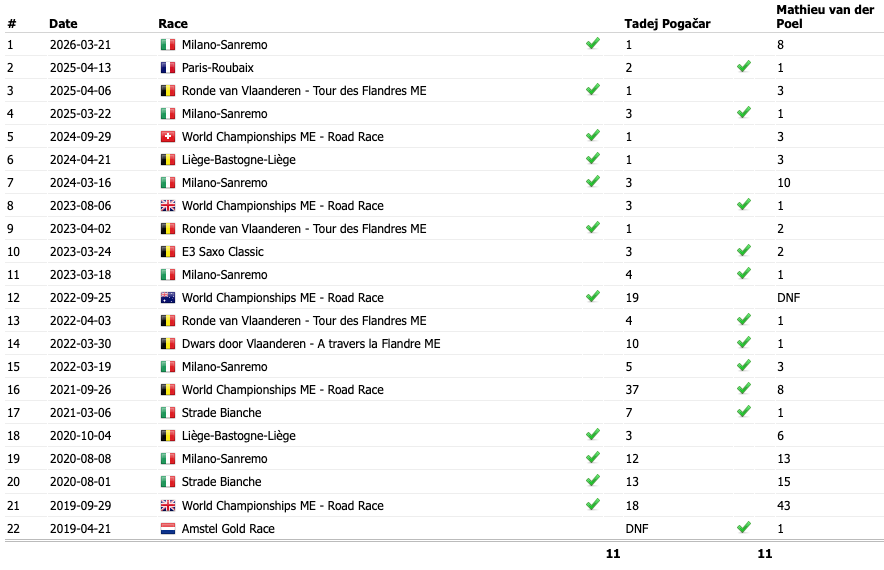 Dato extra: Lo creas o no, Van der Poel y Pogačar están actualmente empatados 11-11 en su historia de enfrentamientos clásicos.