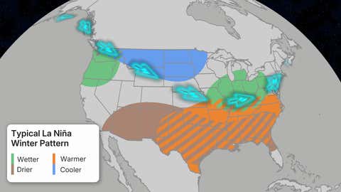 En un invierno típico de La Niña, la corriente en chorro normalmente se fuerza hacia el norte, dejando el sur más cálido y seco. Ese patrón envía la mayor parte de las precipitaciones y temperaturas más frías hacia el norte.