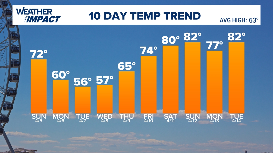 Detrás del frente frío, las temperaturas se volverán más frías a principios de la próxima semana. Para el martes y miércoles por la mañana, las temperaturas mínimas estarán en los 30 grados y las máximas solo en los 50 grados. No permanecerá frío por mucho tiempo, el clima más cálido regresará al final de la semana.