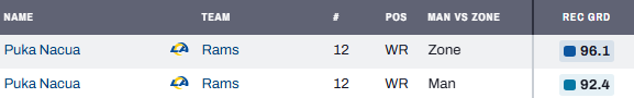 - Ya fuera hombre o zona, Nacua ganó: Emparejó una calificación de recepción PFF de 96.1 contra cobertura de zona con una marca de 92.4 contra cobertura masculina, liderando la liga en ambos.