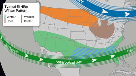 Si El Niño persiste durante el invierno, las corrientes en chorro normalmente se desvían hacia el norte. Como resultado, se esperan inviernos más húmedos y fríos en el Sur, mientras que el Norte se mantiene relativamente seco y cálido en promedio.