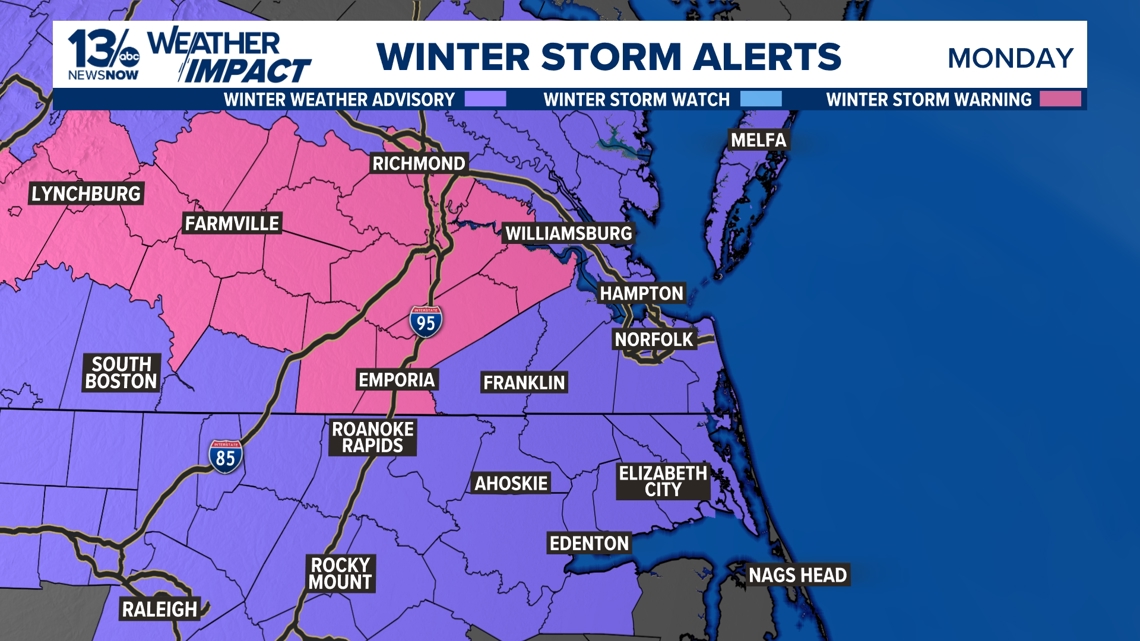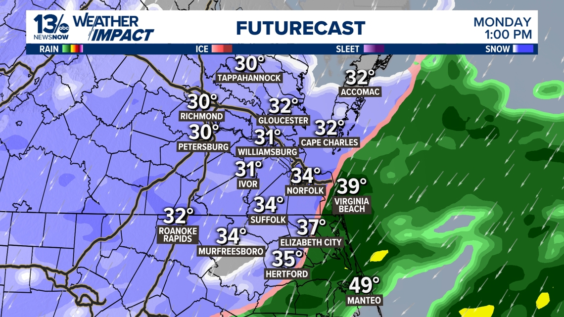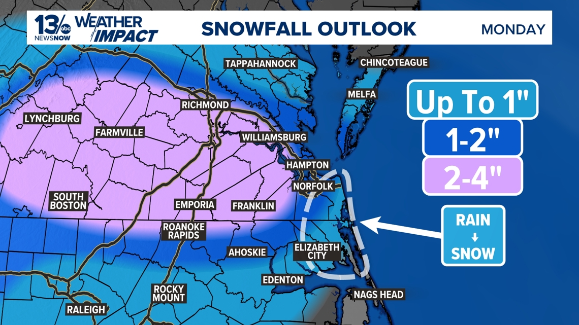 NORFOLK, Va. – El equipo de impacto climático de 13News Now ha declarado una «alerta de impacto climático» para el lunes debido a la posibilidad de nieve, lluvia y una mezcla invernal.