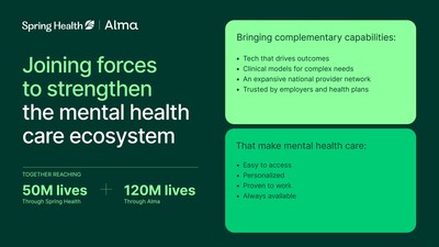 Esta adquisición une a dos líderes de categoría para abordar los desafíos más persistentes en salud mental. A pesar de las mejoras en el acceso a la atención en toda la industria, con demasiada frecuencia las personas luchan por obtener la atención adecuada para sus necesidades o experimentan interrupciones a medida que cambian la cobertura, el empleo o las circunstancias de la vida. La mejor tecnología de su clase y las capacidades comprobadas de atención especializada de Spring Health, junto con las relaciones con el plan de salud nacional de Alma y la sólida infraestructura de proveedores, profundizarán el valor brindado para todo el ecosistema de atención de salud mental.