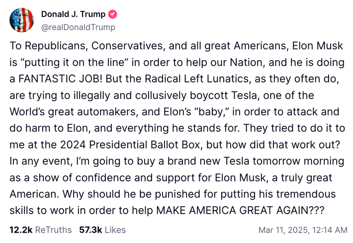 Tan temprano el martes por la mañana, Trump intentó hacer su parte por reclamación«Voy a comprar un nuevo Tesla mañana por la mañana como una muestra de confianza y apoyo para Elon Musk».
