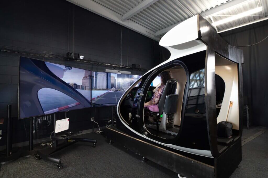 A key part of Joby’s aircraft development is its integrated test lab. A technical mock-up of the aircraft’s systems, the lab uses the actual systems, motors, batteries, and components, all attached to a frame that simulates their location on the aircraft. A fixed-based simulator allows a pilot to “fly” the aircraft while the lab responds to the inputs in real time, allowing engineers to apply loads to the actual hardware that simulate flight and give them insight into how the aircraft will interact in real world scenarios. The lab has been invaluable in Joby’s crawl, walk, run philosophy, allowing the company to safely test components, limitations, scenarios, control design, and more, Allison said.